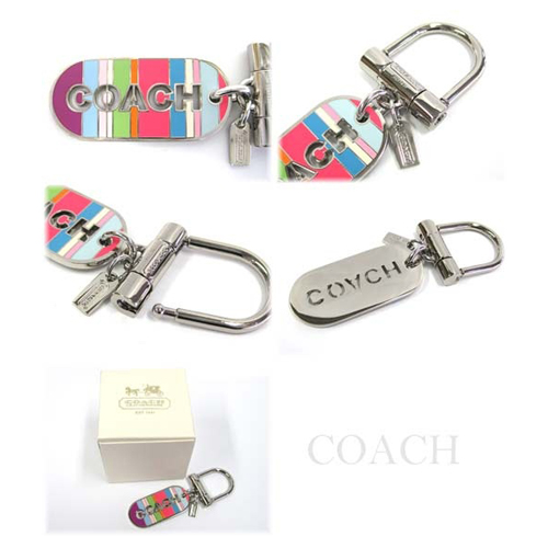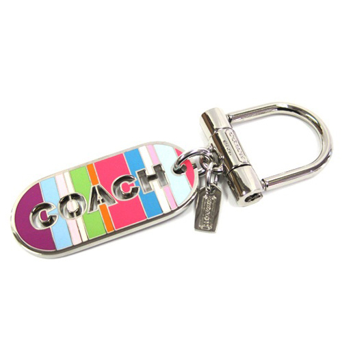コーチのキーホルダーです。コーチのロゴが大きく入ったカラフルなドッグタグ型チャーム、バックなどに付けるととてもアクセントになります。