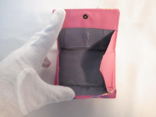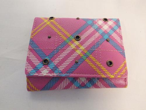 持っているだけでハッピーな気分になれそうな、ピンク色にカラフルなラインの、キュートなチェック柄二つ折り財布です。小銭入れ部分はマチが広く、とても便利です。