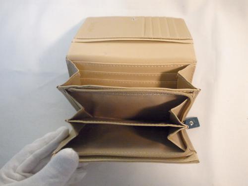 落ち着いた雰囲気のある、ネイビー色の二つ折り財布です。小銭にカード、たっぷり収納できます。小ぶりなのでポケット収納も可能です。