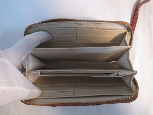 とてもおしゃれでキュートな、キャメル×ベージュのパッチワーク柄ストラップ付きラウンドファスナー長財布です。お札もカードもたっぷり収納できます。