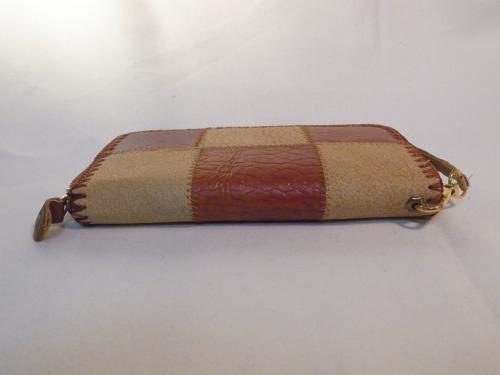 とてもおしゃれでキュートな、キャメル×ベージュのパッチワーク柄ストラップ付きラウンドファスナー長財布です。お札もカードもたっぷり収納できます。